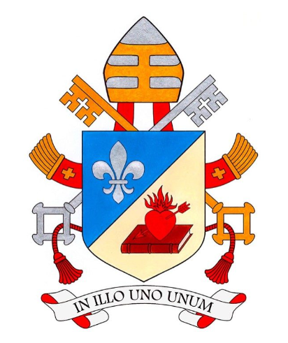 The left field is blue with a silver fleur-de-lis; the right is white, with a flaming heart pieced by an arrow, entirely red, and resting on an uncovered book.Above the shield there is a silver mitre, adorned with three gold bands joined by a gold vertical post, with fluttering red infulae, fringed with gold and adorned with gold crosses; in front of the infulae there are the crossed Petrine keys, gold (bend) and silver (bend sinister), linked by a red cord.
